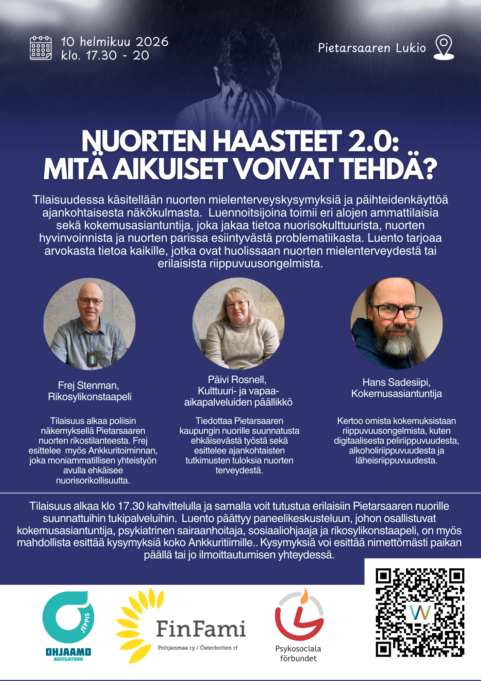 Tilaisuuden järjestävät Ohjaamo Jeppis, Finfami Pohjanmaa ry ja Psykosociala förbundet